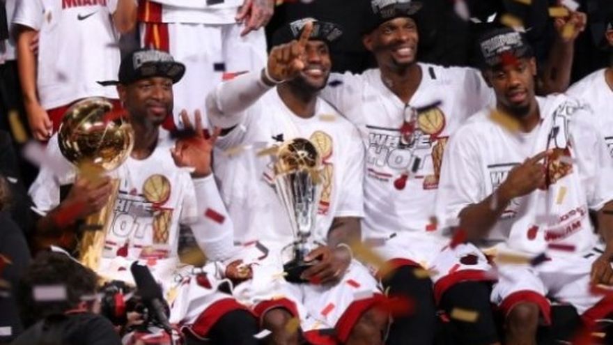 LeBron James y el Heat de Miami siguen encabezando la NBA, y ni siquiera un empujón de los Spurs de San Antonio pudo derribarlos. James condujo al Heat a su segundo título consecutivo al anotar 37 puntos y capturar 12 rebotes para una victoria el jueves de 95-88 en un tenso séptimo partido de la final que estuvo a la altura de las expectativas. James continuó su recorrido estelar a través del mundo del básquetbol, con dos títulos de la liga y una medalla olímpica en los últimos 12 meses. Metió cinco triples, marcó a Tony Parker cuando tuvo que hacerlo, e hizo todo lo que podía esperarse del mejor basquetbolista en el juego. El Heat se convirtió en el primer equipo que repite un campeonato en la NBA desde los Lakers en 2009-10, y el primero en vencer a los Spurs en la final de la liga. Los jugadores y entrenadores se abrazaron tras el partido. Los aficionados se pusieron de pie, aplaudieron y bailaron en los últimos minutos, en que cada canasta era respondida por otra, cada bloqueo con otro. El Heat adquirió una ventaja de seis puntos algunas veces en el último período, pero los Spurs nunca se dieron por vencidos. San Antonio, que apenas dos noches antes estuvo tan cerca de un quinto título, no pudieron encontrar una forma de llevarse este partido, tal vez la última oportunidad que Tim Duncan, Parker y el argentino Manu Ginóbili tendrán de intentarlo juntos. Trataban de convertirse en el primer equipo en ganar un séptimo partido de una final como visitante desde que Washington venció a Seattle en 1978, pero se les acabó el combustible justo antes del final.