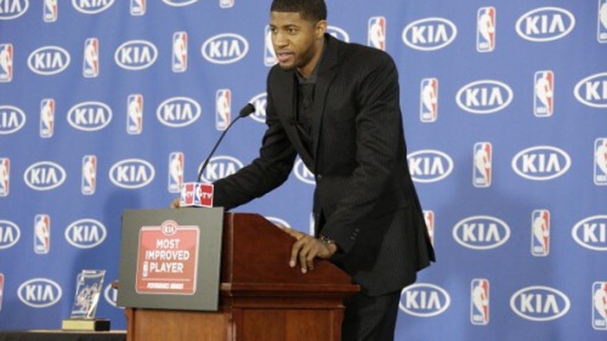El alero de los Pacers de Indiana Paul George fue seleccionado el martes el Jugador Más Mejorado de la NBA en la campaña. El anuncio se produjo menos de dos días después de que George se convirtiese en apenas el segundo jugador en la historia de la franquicia en registrar un triple-doble en los playoffs. George tuvo 23 puntos, 11 rebotes y 12 asistencias en la victoria de los Pacers de 107-90 sobre Atlanta en el primer juego de su serie de playoffs — que le dio a Indiana su primera ventaja de 1-0 en una serie desde el 2006. El segundo partido se juega el miércoles en Indiana. George ganó el premio con amplia ventaja. Recibió 52 votos para el primer lugar y 311 puntos — más del doble del total conseguido por el venezolano Greivis Vásquez, de Nueva Orleáns. Vásquez tuvo 13 votos al primer lugar y 146 puntos. Larry Sanders, de Milwaukee, fue tercero, con 10 votos al primer lugar y 141 puntos. George promedió 17,4 puntos y 7,6 rebotes esta temporada, ambas las mejores cifras de su carrera. La campaña pasada promedió 12,1 puntos y 5,6 rebotes. Es el cuarto jugador de los Pacers en llevarse el galardón, sumándose a Jalen Rose, Jermaine O"Neal and Danny Granger. George ha mostrado consistente mejoría en sus primeras tres campañas en la liga, yendo de regular esporádico en la campaña 2010-11 a miembro pleno del quinteto titular y segunda opción ofensiva del equipo en la de 2011-12. Este año emergió como líder y mayor amenaza anotadora del equipo luego que Granger quedó fuera de acción por una lesión en la rodilla izquierda. Y además, se volvió el mejor defensor de los Pacers.