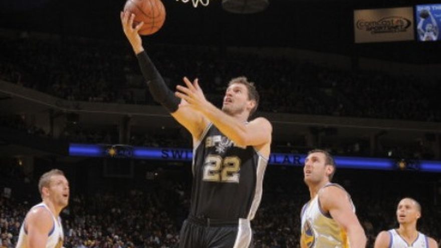 El brasileño Tiago Splitter encestó tras un rebote con 2,1 segundos de juego restantes, dando a unos Spurs de San Antonio mermados por lesiones un triunfo el jueves de 104-102 sobre los Warriors de Golden State. Stephen Curry empató con triple en la posesión previa por los Warriors. Luego de dos fallas de sus compañeros, Splitter se elevó cerca del aro para empujar la canasta decisiva. San Antonio dio la noche libre a Tim Duncan y al argentino Emanuel Ginóbili para que descansaran, y el francés Tony Parker también se ausentó por segundo partido consecutivo con una espinilla derecha lastimada. Los Spurs aun así lograron llevarse la victoria fuera de casa, aprovechando el buen momento de Marco Belinelli, Kawhi Leonard y Patty Mills para propinar a los Warriors otra devastadora derrota en una revancha de las semifinales de la Conferencia del Oeste de la temporada pasada. Splitter jugó 27:48 minutos en los que sumó cinco rebotes, dos asistencias y cuatro puntos, entre ellos los dos tantos del gane.