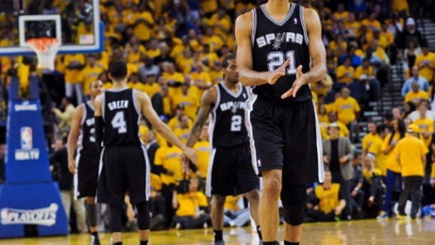 Los Spurs de San Antonio lograron contener un feroz ataque final para derrotar el jueves por 94-82 a los Warriors de Golden State en el sexto juego de su serie de la segunda ronda de postemporada para avanzar a la final de la Conferencia Oeste. Tim Duncan registró 19 puntos y seis rebotes, mientras que Kawhi Leonard anotó 16 unidades. "He dicho que al fin de cuentas éste es un equipo" dijo el entrenador en jefe Mark Jackson. "Verdaderamente creo que eso es exactamente lo que ocurrió. Los muchachos lucharon. Los muchachos me dieron todo lo que tenían. Luchamos. No podría estar más orgulloso de ningún grupo". Tony Parker se sacudió un inició pobre para anotar 10 de sus 13 puntos en el cuarto período. El brasileño Tiago Splitter agregó 14 unidades —la mayor cifra en postemporada durante su carrera— por San Antonio, que tenía ventaja de 13 puntos al final del tercer cuarto. El argentino Emanuel Ginóbili aportó cinco puntos, seis rebotes y 11 asistencias. Stephen Curry acertó 10 de 25 tiros de campo para sumar 22 puntos jugando con molestia en el tobillo izquierdo. Jarrett Jack anotó 15 unidades mientras los Warriors, plagados de lesiones, se agotaban. Los Spurs superaron a Golden State en efectividad de tiros por 45 a 39%. San Antonio, segundo preclasificado, abrirá el domingo en casa la serie final de la conferencia contra Memphis. Los Grizzlies eliminaron a Oklahoma City en cinco juegos. "Va a ser duro", dijo Duncan respecto a la serie final de conferencia. "Si uno pensaba que ésta fue física, va a resultar cerca de 10 grados más". Los Spurs se convirtieron en el primer equipo que gana juegos consecutivos en la serie y en ganar enfrentamientos seguidos a los Warriors en los playoffs, y lo realizaron justo en el momento adecuado. Los Spurs acallaron a los aficionados hacia el final del tercer cuarto y parecía que habían tomado el control de manera definitiva. En lugar de ello, los Warriors retumbaron nuevamente. Klay Thompson, quien sumó 10 puntos tras encestar cuatro de 12 tiros de campo, anotó un tiro de tres puntos al inicio del cuarto período que recortó la ventaja de San Antonio a tres unidades; y un enceste de Curry acercó a los Warriors a 77-75 con 4:52 minutos por jugar. Parker había anotado uno de 13 tiros de campo antes de encestar un tiro desde atrás del arco por la esquina para dar a San Antonio una ventaja de 80-75. Leonard le siguió con dos tiros libres para colocar a los Spurs con ventaja de siete unidades. Jack encestó un disparo de campo y dos tiros libres para acercar nuevamente a los Warriors. Entonces Leonard anotó otro tiro de tres puntos por los Spurs para poner el marcador en 85-79. Curry y Thompson fallaron disparos de tres unidades consecutivos en la misma posesión que pudieron haber mantenido cerca a Golden State. Pero Parker encestó otro de larga distancia para poner a San Antonio arriba por 88-79 con 1:15 minutos en el reloj y envió a las salidas de la arena a algunos de los 19.596 aficionados presentes. "Yo simplemente seguí creyendo en mí", dijo Parker, quien agregó ocho asistencias y terminó encestando tres de 16 tiros de campo. "Mis compañeros de equipo, ellos me respaldaron. Ellos seguían diciéndome, "sigue tirando, van a entrar""". Aficionados calmaron al equipo local con cánticos de "¡Warr-i-ors!" en los últimos segundos. Curry tomó el micrófono después del juego y agradeció a los aficionados desde la mitad de la cancha.
