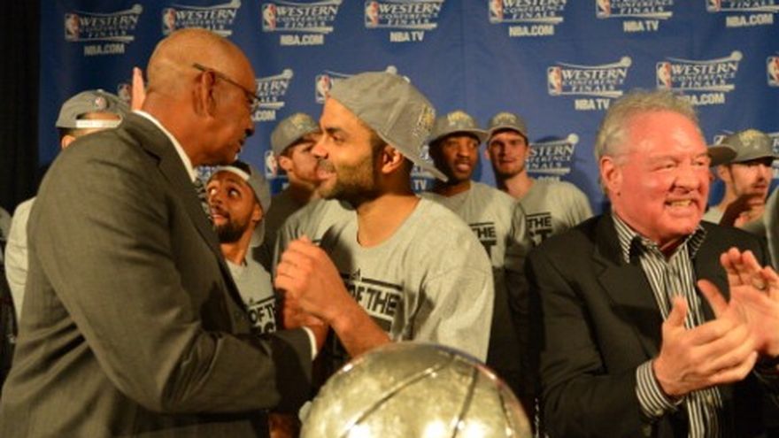 Los Spurs de San Antonio han vuelto a una final de la NBA por primera vez desde que ganaron el campeonato en 2007, y esta vez el viaje es aún más especial para un equipo que era visto como demasiado viejo para competir. Tony Parker tuvo su mejor partido esta postemporada al encestar 37 puntos, y los Spurs completaron el lunes una barrida en la serie por la final de la Conferencia del Oeste al vencer 93-86 a los Grizzlies de Memphis. "Es una gran sensación", dijo Parker mientras se sentaba con el trofeo de campeones de conferencia enfrente de él. "Desde el año pasado le prometí a Tim (Duncan) que regresaríamos a la final y que tendríamos la oportunidad de ganarlo todo, y que trataría de dar lo mejor de mí cada noche. Creo que todos en el equipo queremos hacerlo por él. Ganamos la conferencia y nos falta un paso. Es el paso más difícil". Los Spurs han ganado seis encuentros consecutivos en estos playoffs, y han propinado dos derrotas consecutivas a un equipo que se había mantenido invicto en su cancha, en la que había sido la mejor postemporada en la historia del equipo. Los Grizzlies concluyeron su mejor temporada siendo barridos por el mismo equipo que en cuatro juegos los sacó de su primera aparición en playoffs en 2004. Parker tuvo su mejor partido de la postemporada al encestar 15 de 21 y los seis tiros libres, dando a los Spurs y a Duncan bastante tiempo para descansar antes del primer juego de la final el 6 de junio. "Ha sido asombroso", dijo Duncan sobre Parker. "Cada año se vuelve mejor y mejor y mejor. Se ha echado el equipo al hombro. Esta noche nos levantó el partido entero". Duncan abrazó al argentino Manu Ginóbili antes de entrar en la cancha, celebrando la oportunidad de buscar un título que se le escapó hace un año cuando los Spurs dejaron ir una ventaja de 2-0 ante Oklahoma City al perder cuatro consecutivos. Duncan terminó con 15 puntos y ocho rebotes. Kawhi Leonard sumó 11. Ginóbili tuvo seis puntos y seis asistencias en 25:09 minutos jugados. El entrenador de los Spurs, Gregg Popovich dijo que es probable que por cierto período no caigan en cuenta del hecho de que están de nuevo en la final luego de una sequía de seis años, aunque dijo que se sentía bastante bien. "Uno no espera que eso ocurra a estas alturas con el mismo grupo", dijo Popovich. "Es difícil hacerlo con el mismo grupo. Es difícil hacerlo, mantener algo tanto tiempo. Es una muestra del carácter de estos muchachos y de su capacidad para jugar contra cualquiera. Se merecen mucho crédito por eso".