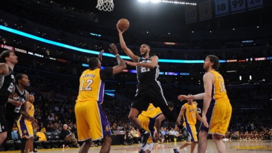 Tim Duncan registró 26 puntos y nueve rebotes, y los Spurs de San Antonio empujaron a los Lakers de Los Ángeles al borde de la eliminación en la primera ronda de la postemporada al vencerlos el viernes por 120-89 en el tercer juego, siendo la peor derrota en casa durante playoff en la historia de la franquicia. Tony Parker anotó 20 unidades y tuvo siete asistencias mientras los Spurs tomaban metódicamente el control de la serie dominando su tercer enfrentamiento consecutivo a los Lakers, quienes jugaron sin sus cuatro principales jugadores perimetrales debido a lesiones. El brasileño Tiago Splitter anotó cinco puntos en 21:59 minutos; acertó uno de cinco tiros de campo y tres de cuatro tiros libres. Registró seis rebotes y dos asistencias. El argentino Emanuel Ginóbili sumó seis unidades en 20:08 minutos. Encestó dos de cuatro tiros de campo y de 1-1 en tiros libres; sumó dos rebotes y tres asistencias Dwight Howard contribuyó con 25 puntos y 11 rebotes, y el español Pau Gasol registró el primer triple doble en postemporada durante su carrera al sumar 11 puntos, 13 rebotes y 10 asistencias por los Lakers, pero los Spurs fueron demasiado para un equipo sin Kobe Bryant y Steve Nash. Andrew Goudelock encestó 20 unidades, la mayor cifra en su carrera, en su primer juego como titular en playoff. Los Spurs pueden ganar la serie si consiguen vencer en el cuarto juego, el domingo por la noche.