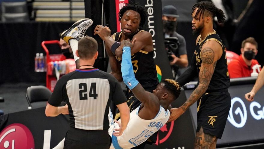El alero OG Anunoby, de los Raptors, fue objeto de una fuerte falta bajo el aro por el base alemán de los Lakers Dennis Schröder, quien después sujetó a su rival para que no cayera al suelo.