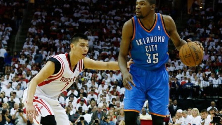 El astro Kevin Durant se echó a los Oklahoma City Thunder encima y con 41 puntos los guió este sábado a una victoria de 104-101 sobre los Houston Rockets para poner su primera serie de playoffs en la Conferencia Oeste 3-0 a su favor. Durant también incluyó en su estelar actuación el canasto decisivo faltando 41,9 segundos para el pitazo final y OKC tratará el próximo lunes de poner fin a este tope con una barrida. El español Serge Ibaka secundó a Durant en la ofensiva por OKC con 17 puntos y 11 rebotes, mientras que por Houston destacaron James Harden, con 30 tantos, C. Pearson, con 21, el dominicano Francisco García, con 18, y el argentino Carlos Delfino con 11 unidades, los dos últimos saliendo de la banca. TOMADO DE: AFP