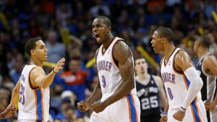 Serge Ibaka metió un rebote ofensivo y se abrió paso hacia la media cancha para flexionar sus músculos en señal de festejo. El congoleño es una fuerza a tener en cuenta y, ¿qué mejor forma de mostrarlo que al proporcionar su mejor partido de la temporada frente a un equipo en el que un jugador lo amenazó en Twitter? Ibaka empató una marca personal en su carrera al encestar 25 puntos y también atrapó 17 rebotes, con lo que ayudó al Thunder de Oklahoma City a llevarse su undécima victoria seguida con un triunfo el lunes por 107-93 sobre los Spurs de San Antonio. La derrota le impidió a San Antonio empatar al Thunder en el mayor número de victorias esta campaña en la NBA. Fue el primer duelo entre ambos equipos desde que Stephen Jackson de San Antonio colocó en Twitter una amenaza en que se refería a Ibaka, granjeándose una multa de 25.000 dólares que le aplicó la NBA. "No quiero hablar de ello", dijo Ibaka, que estableció el ritmo para Oklahoma City al meter sus primeros siete tiros al aro. "Un gran triunfo para nosotros. Necesitábamos eso. Se trata de una victoria en equipo". Jackson acaba de regresar a las canchas después de perderse los últimos 14 partidos tras fracturarse el meñique derecho. Ambos tuvieron una oportunidad de un choque en la primera mitad al interponerse Jackson cuando Ibaka saltó para atrapar un pase de Kevin Durant. Jackson se mantuvo firme con el fin de impedir que Ibaka volcara el balón, y el congoleño cayó al piso. Pero el jugador de los Spurs simplemente alzó su mano para reconocer que él había cometido la falta y la paz prevaleció. "Estoy dejando eso en paz", dijo Jackson. "Todo es sobre básquetbol. Cualquier cosa que haya sido dicha sobre la cancha se quedará en la cancha y voy a dejarlo por la paz. Le deseo a Serge lo mejor". Los Spurs nunca hallaron una respuesta para Ibaka, que al empezar la temporada sólo metió cuatro puntos al tiempo que enfrentó problemas por faltas en la derrota de Oklahoma City en San Antonio. El lunes concluyó con 10 canastas en 16 intentos, condujo al Thunder a una ventaja de 49-37 en rebotes y también bloqueó tres disparos. "Nos lastimó mucho... Estaba metiendo todo", dijo Jackson, que le ofreció disculpas a Ibaka en Twitter después de su primer mensaje. "Es la misma forma en que perdimos el año pasado en los playoffs, cuando él metía esos mismos disparos. Me quito el sombrero. Tuvo un gran juego esta noche". Los franceses Tony Parker y Nando De Colo encabezaron a los Spurs con 14 puntos cada uno. El argentino Manu Ginóbili no jugó porque se golpeó el cuadríceps izquierdo en el triunfo del sábado en Boston. Por su parte, el brasileño Thiago Splitter aportó 10 unidades con cinco canastas en siete intentos durante los 21:35 minutos que estuvo en la cancha. En otro encuentro, Memphis estaba pasando apuros ante los Bulls de Chicago, con tiros fallidos y balones perdidos. Pero luego la banca de los Grizzlies se hizo cargo de la situación, proporcionando el impulso que los ayudó a superar 80-71 a los Bulls. "Creo que fue enorme lo que hicieron", dijo el base Mike Conley de los Grizzlies con relación al desempeño de los reservas en el segundo período. "Entraron y cambiaron el partido, modificaron el ritmo... pusieron el movimiento del balón donde queríamos que estuviera". "Creo que los titulares vieron lo que hacían ellos (los reservas), y lo que fueron capaces de hacer", dijo Conley. "Entramos de nuevo al partido y tratamos de imitarlo". Conley encabezó a Memphis con 17 puntos tras seis canastas en 12 intentos y también repartió cuatro asistencias, mientras que Zach Randolph agregó 10 unidades y capturó 15 rebotes. Rudy Gay tuvo 12 puntos para Memphis pero sólo hizo cinco encestes en 13 tiros al aro, por lo que continuó sumido en un bache. Wayne Ellington anotó sus 11 unidades en el segundo período, cuando los reservas de los Grizzlies proporcionaron el impulso tras un primer cuarto lento en el que Memphis sólo logró meter 11 puntos. Carlos Boozer encabezó a los Bulls con 16 unidades y 13 rebotes, mientras que Marco Belinelli concluyó con 13 puntos. Luol Deng y Joakim Noah metieron 11 unidades cada uno por los Bulls, pero Deng sólo hizo cuatro canastas en 17 tiros desde el piso. "Creo que nuestra defensa fue bastante buena", dijo Noah. "Estamos obteniendo buenos bloqueos... pero simplemente no estamos metiendo esos puntos fáciles". Los dos equipos tuvieron una efectividad ligeramente superior al 37%, pero Memphis hizo seis triples en 11 intentos, mientras que los Bulls sólo metieron dos de 11. Memphis controló los tableros 51-39 y tuvo 18 rebotes ofensivos. En otros partidos de la jornada, el Magic de Orlando venció 102-93 a los Timberwolves de Minnesota; los Clippers de Los Angeles 88-76 a los Pistons de Detroit; los Rockets de Houston 109-96 a los Knicks de Nueva York, y los Suns de Phoenix 101-90 a los Kings de Sacramento.