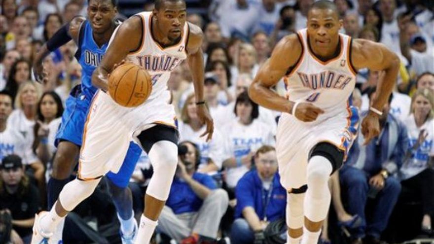 Dirk Nowitzki estaba esperando un rebote benévolo similar al que le permitió a Kevin Durant darle la ventaja al Thunder de Oklahoma City en el primer partido de la serie de primera ronda de playoffs. Cuando Nowitzki no lo consiguió, los Mavericks de Dallas se tuvieron que conformar con otra derrota frustrante y una cuesta arriba para sobrevivir en su primera postemporada luego de llevarse el título de NBA. Russell Westbrook anotó 29 puntos y Kevin Durant agregó 26 el lunes para que el Thunder de Oklahoma City batiera 102-99 al campeón defensor Dallas, para colocarse con una ventaja de 2-0 sobre los Mavericks en la serie de la primera ronda de playoffs de la Conferencia del Oeste. Los Mavs lideraban el partido en el minuto final, en ambos partidos como visitante en Oklahoma City no pudo llevarse ninguno de los dos y el Thunder se llevó ambas victorias con margen total de cuatro puntos. "De eso se tratan los playoffs", dijo Westbrook. "Dureza". Durant encestó dos tiros libres con 50,4 segundos por jugarse para darle a Oklahoma City una ventaja de 98-97, y James Harden anotó otros cuatro tiros libres para cerrar el encuentro para el Thunder. Jason Terry falló dos intentos de triples de la esquina izquierda en los últimos 5 segundos que hubieran dado el empate a Dallas. "Salimos de estos dos encuentros decepcionados, pero no derrotados. Uno se quita el sombrero por el hecho de que hicieron grandes jugadas", dijo el entrenador de Dallas Rick Carlisle. "Ahora, tenemos que ir a casa y hacer lo mismo". El tercer encuentro de la serie se jugará el jueves por la noche en Dallas. "Estamos a un par de rebotes de estar 2-0" dijo el alemán Nowitzki, que lideró a Dallas con 31 puntos pero falló dos tiros en los 75 segundos finales. "Es difícil y frustrante, pero seguiremos intentando. No vamos a desfallecer. Si nos ganan, los vamos a obligar a que se lo merezcan".