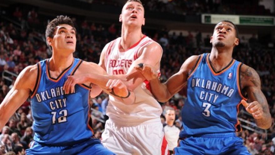 Kevin Durant anotó 36 puntos y Reggie Jackson agregó 23 para guiar al Thunder de Oklahoma City a una victoria el jueves de 104-92 sobre los Rockets de Houston. El Thunder lució en el tercer cuarto para eliminar una desventaja de 12 puntos e igualar el partido al iniciar el cuarto periodo. A partir de ahí, ambos equipos se mantuvieron a una canasta de diferencia hasta que Jackson anotó cinco puntos en racha de 7-0 que dio al Thunder ventaja de 97-89 con cerca de cuatro minutos por jugar. Oklahoma City anotó cuatro puntos en una ofensiva coronada con una clavada de Jackson en rompimiento a velocidad un par de minutos después para ampliar la ventaja a 103-92. James Harden y Terrence Jones anotaron 16 unidades cada uno por Houston, que sólo sumó 19 puntos en la segunda mitad después de imponer la máxima cifra de la temporada con 73 puntos en la primera mitad -estableciendo un record de NBA por la mayor diferencia de puntos para un equipo entre dos mitades de un partido. Oklahoma City ganaba por ocho puntos cuando Dwight Howard y Kendrick Perkins se vieron involucrados en una disputa por un rebote. Ambos tuvieron que ser separados y los árbitros marcaron a Perkins una falta personal luego que los dos cometieron faltas técnicas por la pelea. Serge Ibaka agregó 21 puntos y 15 rebotes por el Thunder. Howard terminó con 11 tantos y ocho tableros por Houston.