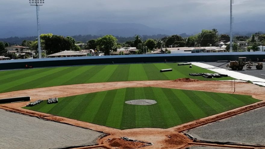El césped colocado es sintético, por lo que será el primer estadio de béisbol en Panamá con ese tipo de superficie.