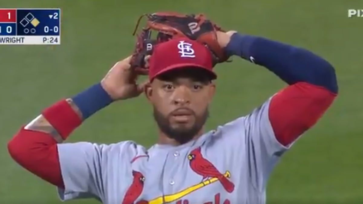 El parador en corto de los Cardenales, el panameño Edmundo Sosa, atrapó un roletazo y al momento de lanzar a primera base, la pelota impactó en el árbitro.