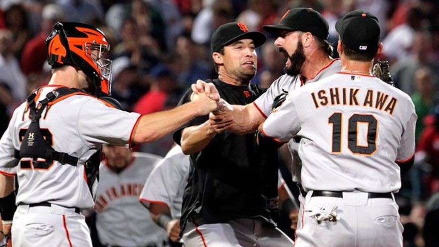 Los Gigantes ganaron otro partido emotivo, de nuevo con ayuda de una endeble defensiva de los Bravos, y San Francisco llegó a la serie de campeonato de la Liga Nacional por primera vez desde el 2002. Para el piloto de los Bravos, Bobby Cox, ya no habrá más partidos. Cody Ross conectó de jonrón y empujó la carrera decisiva con un sencillo en la séptima entrada para guiar el lunes a los Gigantes a la victoria por 3-2 en el cuarto partido de la serie, y para terminar con una serie divisional que fue cerrada y tensa hasta el último out. Cada encuentro fue decidido por una carrera, pero los Gigantes ganaron tres de los cinco posibles y consiguieron la posibilidad de enfrentar a Filadelfia, el dos veces campeón defensor de la Nacional. El primer partido es el sábado en Filadelfia. Luego de que el dominicano Melky Cabrera, con dos corredores a bordo, bateó un rodado para el out que puso fin a la serie y a la carrera de Cox, los aficionados exclamaron "Bobby! Bobby! Bobby!" El manager, que se retira esta temporada, salió por fin de la caseta y saludó con la mano en la gorra. Incluso los Gigantes detuvieron por un momento la celebración para aplaudirle a Cox y saludarlo tocándose la guerra con la mano desde el lado de los triunfadores en el terreno de juego. "Gracias, Bobby Cox", se leía en una pantalla gigante mientras en el estadio resonaba la melodía de "Georgia On My Mind". Cox se conmovió al mencionar que por última vez se quitaría su uniforme con el número 6. "Ya no me lo pondré", dijo. Cuando le preguntaron si le había hablado a sus jugadores, dijo con la voz entrecortada: "Lo hice lo mejor que pude. Les dije que estaba muy orgulloso de ellos". El abridor Derek Lowe de Atlanta tuvo un intento de partido sin hit hasta la sexta entrada, pero no fue suficiente. Los Bravos no han conocido la victoria en el Turner Field con una serie de por medio, pues perdieron por octava vez consecutiva en esa situación desde que el estadio fue inaugurado para el béisbol en 1997. Cox ya no tendrá la posibilidad de acabar con ese maleficio debido a que hace más de un año decidió suspender su carrera a los 69 años. Ahora se dirige al retiro como el cuarto manager con más triunfos en la historia de las mayores (2.504 victorias en temporada regular), lo que seguramente lo llevara al Salón de la Fama de Cooperstown, pese a una deficiencia significativa: en 16 viajes a la postemporada —uno con Toronto, 15 con los Bravos— los equipos de Cox capturaron sólo un título de Serie Mundial, en 1995. Un aficionado de los Bravos sostenía un cartel implorando al equipo "Gánenlo por Bobby", pero Ross y los Gigantes no andaban de ánimo para sentimentalismos. Ni siquiera con la conveniencia de saber que el quinto juego regresaría a San Francisco y que el astro Tim Lincecum estaba descansado y preparado para trabajar después de un desempeño de dos imparables y 14 ponches en el primer juego. Ahora, Lincecum está listo para abrir el primer juego de la serie de campeonato de la Nacional contra Roy Halladay, quien lanzó un juego sin hit la semana pasada en su debut en postemporada. Filis y Gigantes dividieron honores en seis juegos esta temporada. Los Bravos no pudieron culpar de esta derrota a Brooks Conrad. El campocorto venezolano Alex González tuvo dos errores, incluyendo un lanzamiento alto en la decisiva séptima que le permitió a Ross anotar con dos outs. Ross conectó por la izquierda un sencillo con la casa llena que remolcó la carrera del desempate. Conrad no jugó como titular después de cometer tres errores en el juego tres, en el que los Bravos estuvieron a un out de ganar para tomar la delantera en la serie. Los Gigantes resistieron luego de estar dos veces abajo en el cuarto partido, con su novato Madison Bumgarner en la lomita. El zurdo, de 21 años, lanzó como un veterano, al tolerar seis imparables y dos carreras en seis entradas. Por los Gigantes, el puertorriqueño Andrés Torres de 4-0. El dominicano Juan Uribe de 3-0 con una carrera producida. El colombiano Edgar Rentería de 1-1. Por los Bravos, los venezolanos Omar Infante de 5-1 con una carrera anotada; y Alex González de 4-1. Los dominicanos Melky Cabrera de 2-0; y Diory Hernández de 1-0.