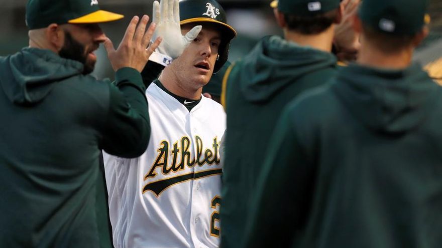 El bateador designado Mark Canha pegó volado de sacrificio en el décimo episodio y los Atléticos de Oakland superaron 5-4 a los Angelinos de Los Ángeles.