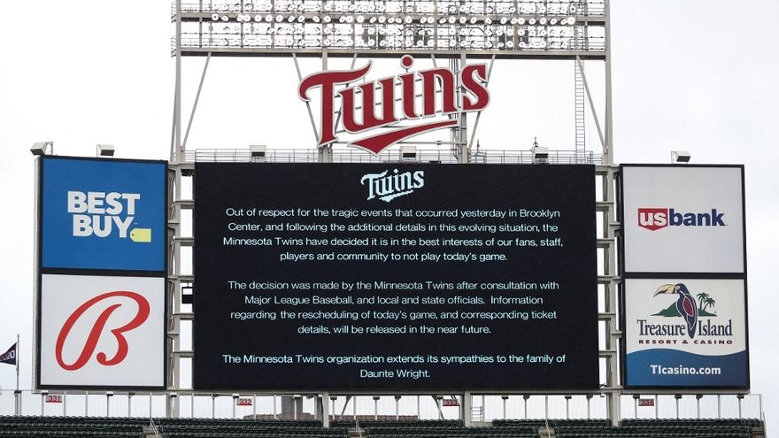 "Por respeto a los trágicos eventos que ocurrieron ayer en el Brooklyn Center, y siguiendo los detalles adicionales en esta situación en evolución, los Mellizos de Minnesota han decidido que lo mejor para nuestros fanáticos, personal, jugadores y comunidad es no jugar el partido de hoy (lunes)".