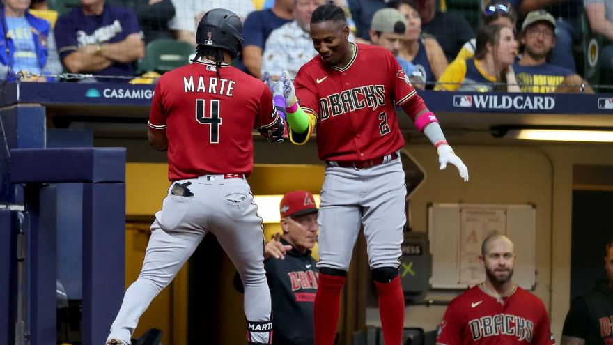 Con jonrones de Corbin Carroll, el dominicano Katel Marte y el venezolano Gabriel Moreno, los D'Backs de Arizona vencieron este martes 6x3 a los Cerveceros de Milwaukee para salir al frente 1-0 en su serie de primera ronda de playoffs de la Liga Nacional.