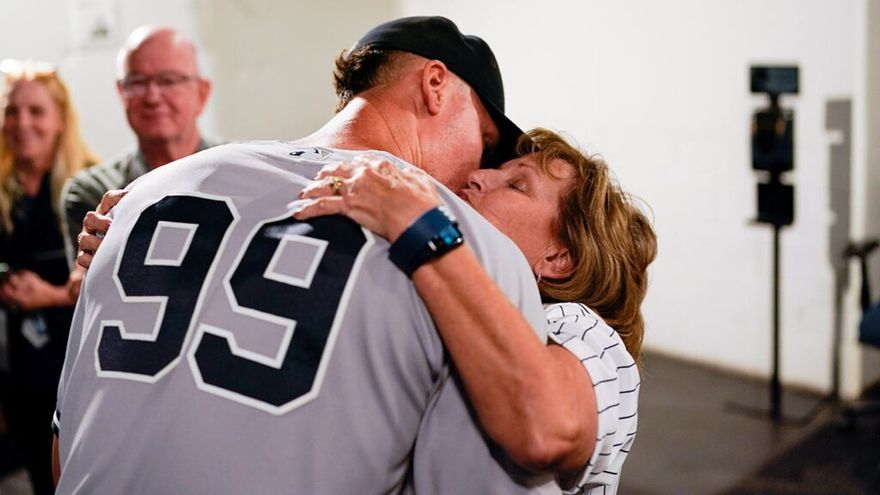 Después de culminar el partido, en el que bateó su cuadrangular 61 de la temporada, Aaron Judge se dirigió a su madre y le regaló la pelota con la que bateó el vuelacercas y ambos se entrelazaron en un fuerte abrazo.