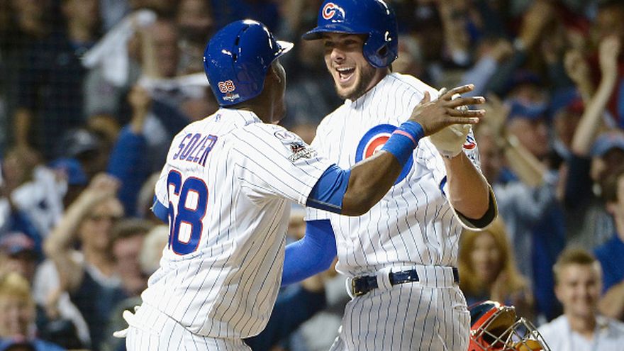 Kris Bryant (de frente) y Jorge Soler (de espalda) conectaron jonrones en el partido / Getty Images