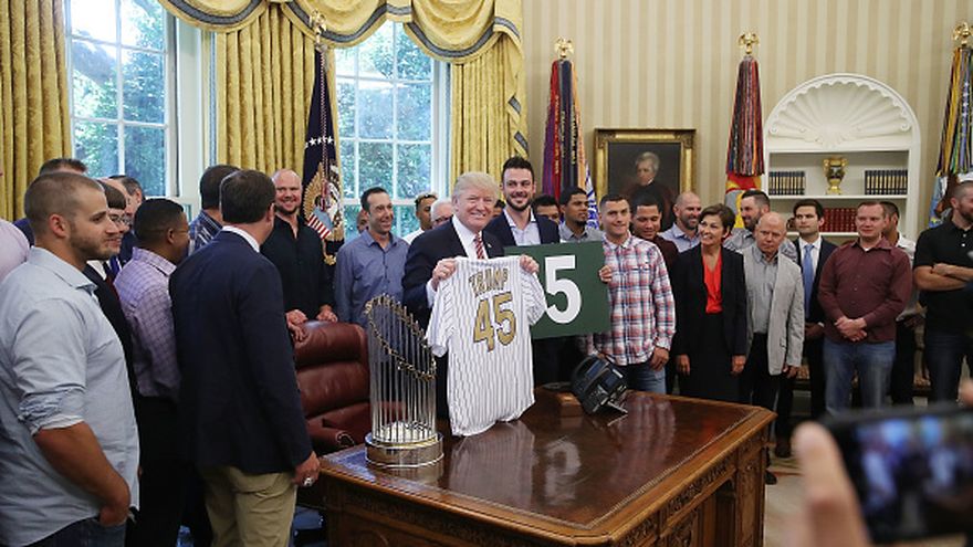 Los Cachorros hicieron su segunda visita a la Casa Blanca este año el miércoles, durante la cual le obsequiaron al Presidente Donald Trump un número 45 de la pizarra del Wrigley Field además de una camiseta.