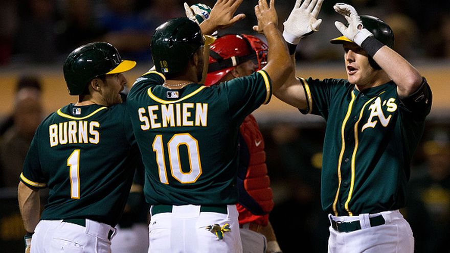 OAKLAND, California, EE.UU. (AP) -- Un jonrón de tres carreras de Mark Canha y un doble de Jake Smolinski que permitió otras tantas en el decisivo tercer inning abrieron las puertas a un triunfo por 11-5 de los Atléticos de Oakland sobre los Angelinos de Los Ángeles el lunes, en otra noche extraña en el Coliseum tras la caída de una parte del muro del jardín y la consiguiente demora en el juego.