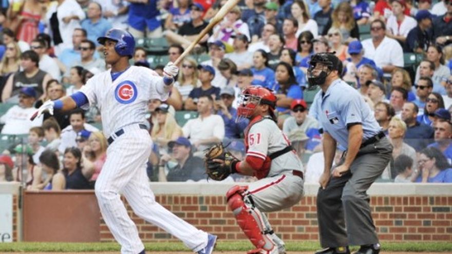 El dominicano Starlin Castro bateó un cuadrangular solitario que rompió el empate en la sexta entrada para guiar el sábado a los Cachorros de Chicago a una victoria por 4-3 sobre los Filis de Filadelfia. Cole Gillespie produjo dos carreras con un sencillo y un elevado de sacrificio, con lo que ayudó a los Cachorros a obtener su cuarto triunfo en 20 partidos en casa desde la pausa por el Juego de Estrellas. Castro, Junior Lake, el dominicano Wellington Castillo y Darwin Barney conectaron dos hits cada uno. Castro bateó un lanzamiento rápido a Zach Miner (0-1) por el jardín central para su octavo cuadrangular de la temporada. El cañonazo al principio del episodio fue su primero sobre la cerca desde el 31 de julio contra los Cerveceros de Milwaukee. El dominicano Carlos Villanueva (3-8) se llevó la victoria luego de una labor de una entrada y un tercio, en la que recibió un imparable. Por los Filis, el panameño Carlos Ruiz de 4-1, con una carrera producida. Por los Cachorros, los dominicanos Castro de 5-2 con una carrera anotada y una producida; y Castillo de 4-2 con una anotada y una impulsada.