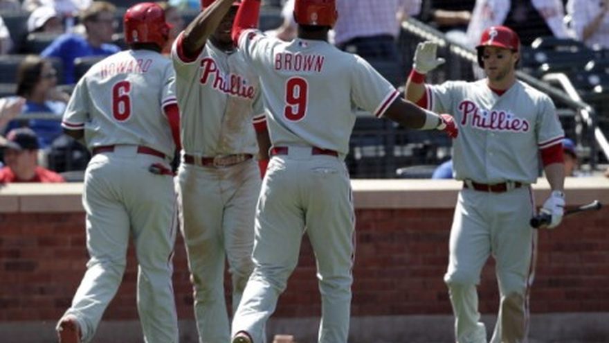 Domonic Brown y John Mayberry Jr. conectaron jonrones consecutivos y los Filis de Filadelfia vencieron el sábado 9-4 a los Mets de Nueva York, con lo que Jonathan Pettibone obtuvo su primera victoria en las mayores. Ryan Howard produjo dos carreras, Jimmy Rollins anotó dos veces y Michael Young conectó tres hits —todos dentro del cuadro interior— por segundo día seguido. Pettibone (1-0) escapó de un atolladero para que Filadelfia tenga ahora marca de 4-1 esta campaña contra los Mets luego de perder la serie particular entre ambos el año pasado. Shaun Marcum (0-1) cubrió cuatro innings en su debut con los Mets, luego de iniciar la campaña en la lista de lesionados por una dolencia en el cuello y tendonitis en el bícerps derecho. John Buck disparó su octavo jonrón en el noveno, pero ya era demasiado tarde para evitar la quinta derrota de los Mets en sus últimos ocho partidos como local. Por los Filis, los venezolanos Humberto Quintero 4-0 y Freddy Galvis de 1-0. Por los Mets, el panameño Rubén Tejada de 3-1, una anotada. Los dominicanos Jordany Valdespín de 4-1, una remolcada y Juan Lagares de 1-0.