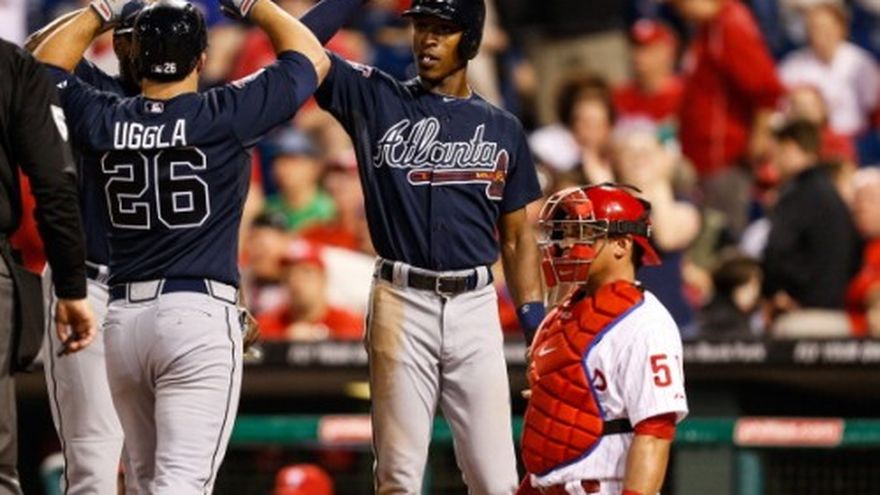 FILADELFIA (AP) -- Dan Uggla conectó dos jonrones, incluyendo un grand slam en la novena entrada que llevó a los Bravos de Atlanta a un dramático triunfo de 9-6 sobre los Filis de Filadelfia la noche del lunes. Evan Gattis también conectó un par de cuadrangulares por los Bravos, que ligaron su cuarto triunfo seguido. Los equipos se combinaron para cinco jonrones y 12 carreras en las últimas dos entradas. Gattis, Uggla y Andrelton Simmons conectaron jonrones consecutivos en la octava entrada para poner a Atlanta al frente 5-1. El batazo de vuelta entera de Domonic Brown con dos a bordo coronó una parte baja de la octava entrada de cinco carreras para Filadelfia, con lo que se fueron al frente 6-5. Pero los Bravos vinieron de atrás ante Jake Diekman (1-1). B.J. Upton recibió pasaporte, Freddie Freeman llegó a primera cuando el camarero Chase Utley intentó poner fuera en segunda a Upton y Justin Upton recibió base por bolas. En la loma de Filadelfia, los dominicanos Roberto Hernández se fue sin decisión al trabajar seis entradas en las que admitió dos carreras y cuatro hits con tres ponches y seis bases. Luis García trabajó una entrada con un ponche en labor de relevo. Luego de que Gattis se ponchó, Uggla conectó en cuenta de 0-2 ante Diekman por encima de la barda de jardín izquierdo. El venezolano Luis Avilán (3-1) terminó acreditándose el triunfo, pese a admitir cinco carreras y cuatro imparables con una base y un ponche en una entrada de labor, y David Carpenter se agenció su primer rescate. En el montículo, por Atlanta, el dominicano Ervin Santana salió sin decisión en trabajo de seis entradas en las que admitió una carrera y cuatro hits. Ponchó a 11 enemigos y dio dos boletos. Por los Bravos, el mexicano Ramiro Peña se fue de 3-1 con doblete a la ofensiva Por los Filis, el panameño Carlos Ruiz se fue de 3-0 con boleto a la ofensiva.