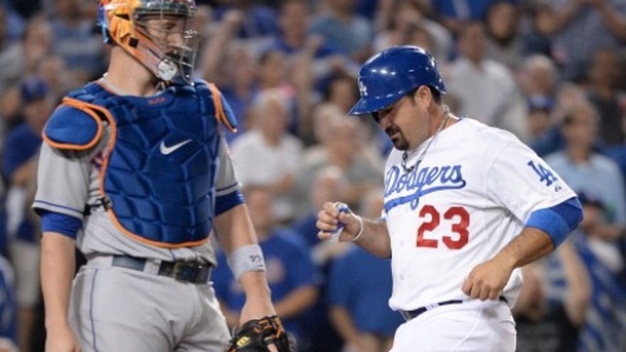 El mexicano Adrián González anotó la carrera del desempate en un elevado de sacrificio del cubano Yasiel Puig que coronó una sexta entrada que llegó con tres anotaciones para ayudar a los Dodgers de Los Ángeles a vencer 4-2 el lunes a los Mets de Nueva York, en su sexta victoria consecutiva. Los Dodgers mejoraron su foja a 38-8 desde el 22 de junio, la mejor hilada de 46 partidos del equipo en la era moderna que comenzó en 1900. González se fue de 4-3 e impulsó una carrera por séptimo partido consecutivo, la racha más larga de producidas con el equipo esta temporada. Ricky Nolasco (9-9) extendió a cuatro su racha ganadora. El derecho permitió dos carreras y siete imparables en seis entradas y un tercio. Ponchó a dos y dio dos bases por bolas, y retiró a 11 bateadores consecutivos de un tirón. Kenley Jansen sacó los últimos cuatro outs para ganar su 18vo salvamento en 21 oportunidades. El dominicano Jenrry Mejía (1-2) permitió tres carreras -dos limpias- y seis imparables en seis entradas y acabó con la racha de dos ganados de los Mets. Por los Dodgers, el mexicano González de 4-3, una anotada, una impulsada. El cubano Puig de 3-0, una impulsada. El dominicano Juan Uribe de 3-1. Por los Mets, los dominicanos Juan Lagares de 5-0; y Mejía de 2-0. El venezolano Wilmer Flores de 4-1, una anotada.