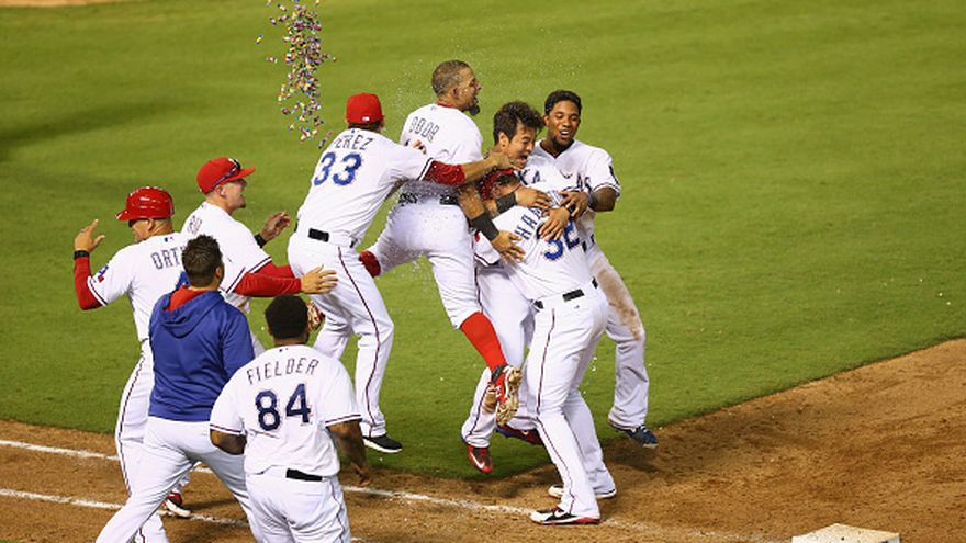 Delino DeShields recibió un boleto en el primer turno al bate de la novena ante Nick Goody (0-1), que debutaba en las Grandes Ligas. El cerrador de los Yanquis, Andrew Miller, sacó al venezolano Elvis Andrus en un elevado profundo antes de que DeShields se convirtiese en el segundo eliminado tras ser golpeado en el pie por un fuerte lanzamiento del cubano Leonys Martin cuando corría las bases.