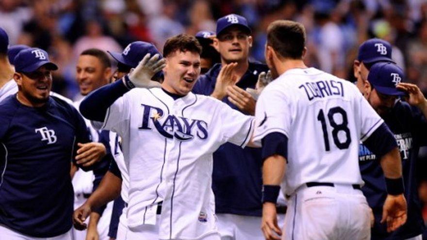 José Lobatón disparó un jonrón solitario con dos outs en la parte baja del noveno inning, y los Rays de Tampa Bay esquivaron otra vez ser eliminado al vecer el luens 5-4 a los Medias Rojas de Boston. Los Rays descontaron la ventaja de Boston en la serie de primera ronda de los playoffs de la Liga Americana, ahora 2-1. El cuarto partido será el martes con Jake Peavy como el abridor de los Medias Rojas ante Jeremy Hellickson. Por cuarta vez en nueve días, los Rays disputaron un juego al borde del abismo. Pero Tampa Bay no se amilana y esta vez encontró su salvador en el venezolano Lobatón, el receptor que salió de la banca en las postrimerías para conectar el jonrón más memorable de su carrera ante el cerrador Koji Uehara. Lobatón deposió la pelota en el acuario colocado detrás del muro del Tropicana Field. Los Rays vinieron de abajo al entrar perdiendo 3-0 en la baja del quinto, en la que Evan Longoria empató el juego al sacudir un jonrón de tres carreras con dos outs ante Clay Buchholz. Delmon Young, acostumbrado a producir carreras en momentos clave en el mes de octubre, adelantó 4-3 a los Rays con una roleta remolcadora en el octavo. Pero los Medias Rojas lograron empatar en el noveno ante el dominicano Fernando Rodney, el cerrador de Tampa Bay. Un roletazo de Dustin Pedroia trajo la anotación del 4-4. Rodney se acreditó la victoria cuando el batazo de Lobatón viajó por el bosque derecho-central. Por los Medias Rojas, el dominicano David Ortiz de 1-1 con una empujada. Por los Rays, el venezolano Lobatón de 1-1 con una anotada y una producida. El cubano Yunel Escobar de 4-2 con una anotada. El puertorriqueño José Molina de 3-0.