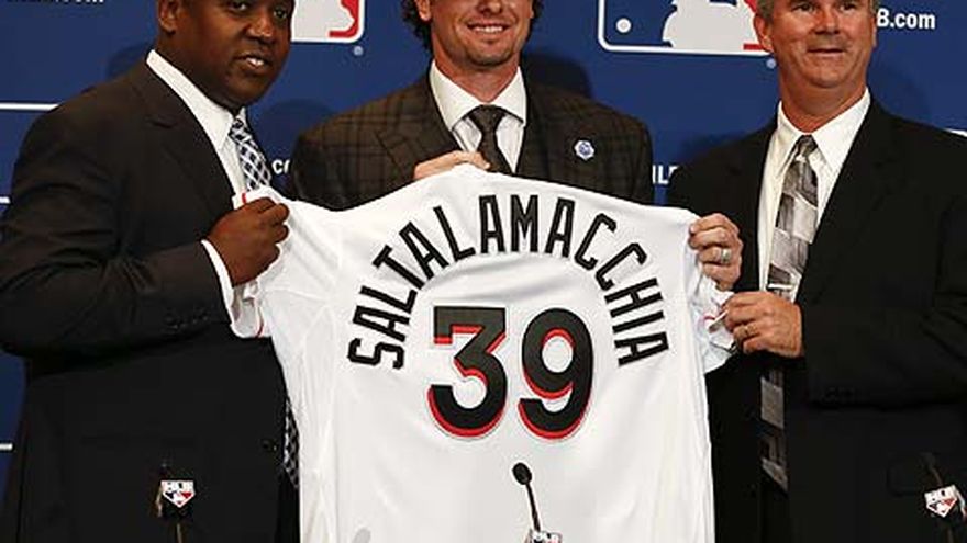 Luego de ganar una Serie Mundial con los Medias Rojas, el receptor Jarrod Saltalamacchia oficialmente firmó su contrato de tres años y US$21 millones con los Marlins y fue presentado por el equipo en una rueda de prensa en las Reuniones Invernales. El pasar de un equipo campeón a un conjunto que acaba de sufrir 100 derrotas no parece ser una situación ideal, pero Saltalamacchia piensa que esto será algo que beneficiará a todos. "En Boston, el año anterior perdimos 93 partidos y esta campaña terminamos en la cima", explicó el cátcher. "No hay motivos para que no hagamos lo mismo aquí. Tenemos un gran grupo de abridores. Ahí es donde todo comienza y termina". El firmar a Saltalamacchia le brinda a Miami la producción en una posición que no pensaban que existían buenas alternativas en el mercado. Los Marlins en el 2013 ocuparon el último puesto en carreras anotadas y cuadrangulares. Por su parte, Saltalamacchia tuvo un promedio de .273 con 14 jonrones, 40 dobletes y 65 empujadas.