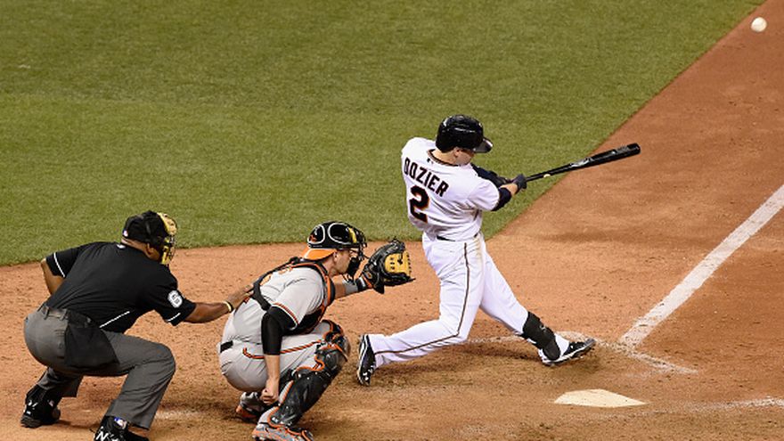 Dozier conectó de línea en cuenta de 2-1 un lanzamiento de Tommy Hunter (2-2) y envió la pelota a la tribuna del jardín izquierdo para su 17mo batazo de vuelta entera en la temporada.