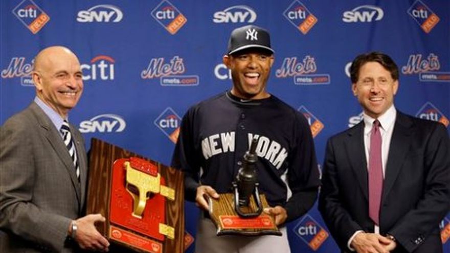 El cerrador panameño Mariano Rivera de los Yanquis de Nueva York fue homenajeado el martes por los Mets y por los bomberos de la ciudad antes de su última visita al Citi Field. Jeff Wilpon, director ejecutivo de los Mets, entregó a Rivera una boquilla de manguera contra incendios, mientras que Sal Cassano, jefe de los bomberos de la urbe, le dio al líder de más partidos salvados en la historia una alarma contra fuego durante una breve ceremonia dentro del estadio. Wilpon dijo que le gustaría ver de nuevo a Rivera en la Serie Mundial. El lanzador, que planea retirarse al concluir esta campaña, también aceptó una invitación de Wilpon para lanzar la primera pelota antes del duelo del martes entre los rivales de ciudad. Después de una demora por lluvia que se extendió 91 minutos, un Rivera sonriente subió al montículo y envió la pelota a John Franco, líder de los Mets en partidos salvados, ubicado detrás del plato. Justo antes, los Mets presentaron un video en homenaje a Rivera que concluyó con la siguiente frase: "Felicitaciones por una carrera para el Salón de la Fama".