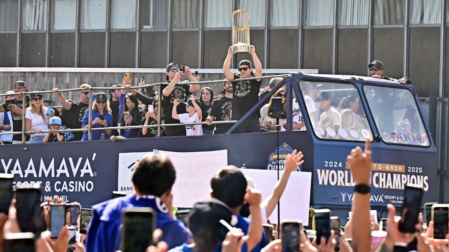 Una lluvia de confeti azul envolvió una caravana de autobuses descapotables que transportaban a los jugadores en un lento recorrido por el centro de Los Ángeles, dos días después de su épica victoria en la Serie Mundial de béisbol contra los Azulejos de Toronto.