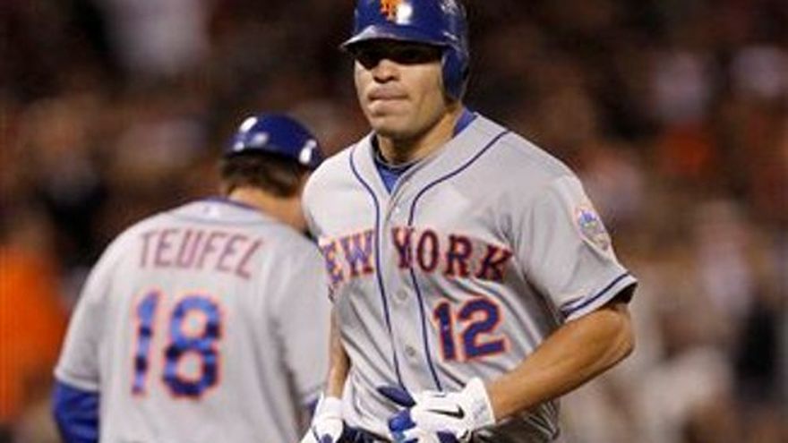 Scott Hairston bateó su segundo jonrón del partido, botando la pelota en el 10 inning para dar el lunes a los Mets de Nueva York una victoria de 8-7 sobre los Gigantes de San Francisco. Los Gigantes han perdido cinco en fila, todos en casa, pero aún encabezan la división oeste de la Liga Nacional por medio punto de porcentaje sobre los Dodgers. Hairston bateó un jonrón de dos carreras en el octavo, cuando los Mets anotaron cuatro veces para tomar una ventaja de 6-4. Buster Posey y Nate Schierholtz batearon dobletes impulsores por los Gigantes, para empatar la pizarra en el noveno por los Gigantes. Pero la noche fue de Hairston, que botó la pelota con la casa limpia en el 10 y los Mets anotaron otra más por un error. Los Gigantes descontaron una en su mitad, antes que Manny Acosta se llevase su primer salvamento del año. Santiago Casilla (4-5) fue el derrotado. Josh Edgin (1-0) logró su primer triunfo en las mayores. Por los Mets, el panameño Rubén Tejada de 6-1. El boricua Andrés Torres de 3-2. El venezolano Ronny Cedeño de 3-1, dos empujadas. Por los Gigantes, los venezolanos Marco Scútaro de 4-2, una anotada y una empujada; y Gregor Blanco de 3-0. El dominicano Melky Cabrera de 6-2, una anotada y una empujada. El boricua Ángel Pagán de 3-0.