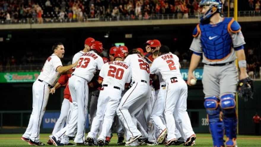 Un elevado de sacrificio de Steve Lombardozzi en la novena entrada le dio a los Nacionales de Washington su primera victoria con remontada en el último episodio de esta temporada, al vencer el martes 3-2 a los Mets de Nueva York. Los Nacionales ganaron por primera ocasión esta temporada después de ir perdiendo tras seis innings. Con eso rompieron una racha de dos derrotas y dejaron su foja en 29-29. Contra el cerrador Bobby Parnell (4-2), Ryan Zimmerman abrió la novena entrada con un doblete a la derecha, superando a duras penas el roce del guante en la segunda base y luego avanzó a tercera con un lanzamiento descontrolado del relevista. Adam LaRoche pegó un sencillo para impulsar a Zimmerman a home e igualar la pizarra. Ian Desmond bateó un doble al jardín izquierdo y Roger Bernadina recibió un pasaporte intencional para llenar las bases sin ningún out para Lombardozzi, cuyo elevado al jardín izquierdo fue más que suficiente para que anotara LaRoche. La derrota estropeó un buen trabajo de Jeremy Hafner, el abridor de los Mets que toleró una carrera y cuatro hits en siete innings. Tyler Clippard (4-1) lanzó en el noveno para acreditarse el triunfo. Jordan Zimmermann, el abridor de los Nacionales, se fue sin decisión al permitir cuatro hits y un par de carreras sucias. Por los Mets, el dominicano Jordany Valdespín de 3-2, una anotada.
