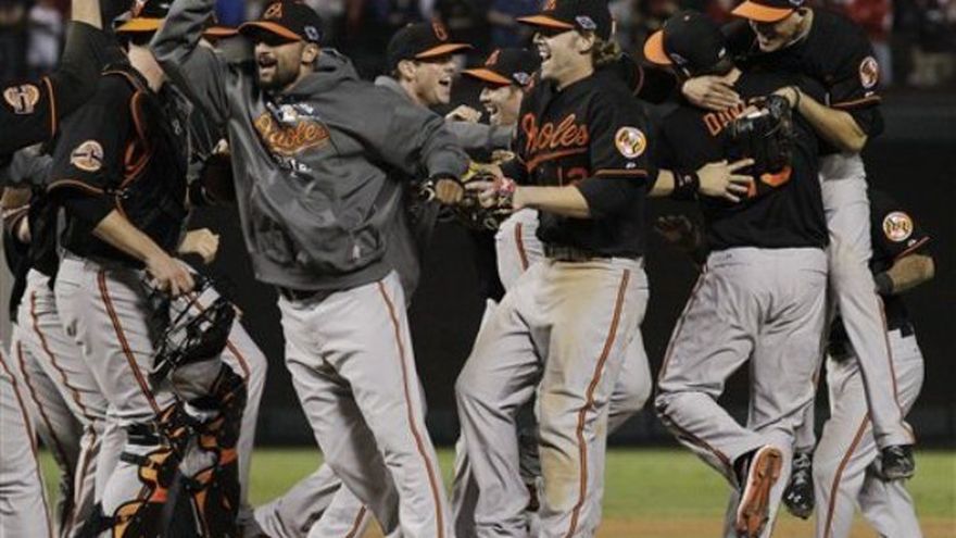 Joe Saunders trabajó bien hasta el sexto inning, Adam Jones rompió el empate con un elevado de sacrificio y los Orioles de Baltimore vencieron el miércoles a los bicampeones de la Liga Americana Rangers de Texas 5-1 en el playoff de los wildcard. Nate McLouth anotó en el primer episodio y empujó dos después de eso para los sorprendentes Orioles del manager Buck Showalter, que hicieron su primera presentación en postemporada en 15 años. Baltimore avanza para jugar contra los Yanquis de Nueva York en una serie divisional a cinco juegos que comienza el domingo en el Camden Yards. The Rangers, que perdieron la corona del oeste al perder nueve de sus últimos 13 partidos en la campaña regular, se van a casa tras un partido en el que enviaron al montículo al as Yu Darvish. Texas llenó las bases con dos outs en el noveno antes que David Murphy cediese el último con un elevado.