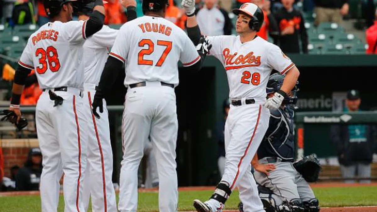 BALTIMORE (AP) -- Steve Pearce conectó el primer grand slam en su vida y los Orioles de Baltimore se sobrepusieron a un largo retraso por la lluvia y a un intento de remontada de los Marineros de Seattle, para imponerse el jueves por 5-4.