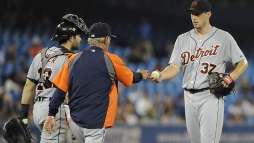 La victoria de Max Scherzer del miércoles quedó manchada con mala leche. Scherzer trabajó hasta la séptima entrada para convertirse en el primer pitcher en 27 años en arrancar la temporada 13-0, al ayudar a los Tigres de Detroit a vencer por 6-2 a los Azulejos de Toronto. Alex Avila pegó un cuadrangular de tres carreras y el venezolano Víctor Martínez pegó uno solitario en el octavo triunfo de Detroit sobre Toronto de sus últimos 10 encuentros. Los Tigres estaban molestos con Colby Rasmus luego de que dejó fuera de acción al segunda base de Detroit, el venezolano Omar Infante, con una dura barrida en el cuarto episodio. "Estamos de verdad enfadados por esa barrida", dijo Scherzer. "Es una jugada muy sucia. Cuando miras la repetición, ves que levantó los spikes, y que se barrió tarde". Luego de ser golpeado por un lanzamiento de Scherzer, Rasmus se barrió fuerte contra infante en una roleta bateada por Rajai Davis que tomó el campocorto y pasó a Infante, con lo que rompió la posibilidad de una doble matanza. La pierna derecha de Rasmus chocó con la espinilla izquierda de Infante, lo que lo hizo retorcerse de dolor. Infante, quien fue sustituido por el dominicano Ramón Santiago, necesitó ayuda para salir caminando del terreno de juego, pero las radiografías no mostraron fracturas. El mánager de los Tigres Jim Leyland dijo que Infante no jugaría el jueves. Scherzer dijo que Rasmus merecía ser suspendido por lesionar a Infante, a quien describió como "una importante razón por la que hemos estado bien este año". "Esa es una situación en la que, si fuéramos a vengarnos de él, nos suspenderían, pero en realidad es él quien debería ser suspendido por hacer una barrida como esa", dijo Scherzer. "Se barrió muy tarde. Entiendo que juegue duro, pero esa no es una jugada limpia y no nos gusta", dijo. El director de los Azulejos John Gibbons se negó a comentar, ya que, según dijo, no quería "inflamar" la situación. Rasmus, en tanto, negó que se barriera de manera distinta a la habitual. "Yo siempre entro duro", dijo Rasmus. "Mi intención nunca es lastimar a nadie ni nada por el estilo". Ambas bancas se vaciaron luego de que el jardinero de los Tigres Torii Hunter se molestó al ser golpeado por un lanzamiento del relevista Todd Redmond en la sexta. "Créeme, no es nada contra Redmond", dijo Hunter. "Fue por Rasmus que se barrió tarde con los spikes de frente". Hunter dio unos pasos hacia el montículo y gesticuló luego de recibir el pelotazo en el hombro izquierdo. El umpire de home Mike Estabrook tomó a Hunter y este fue rápidamente abrazado por su compañero Prince Fielder. "Es la única manera como puedo desahogarme y quería desahogarme", dijo Hunter. No hubo golpes, y el partido se reanudó tras una breve reunión de los umpires, no sin antes de que Estabrook hiciera una advertencia a ambas bancas. Scherzer (13-0) permitió dos carreras y siete imparables, ponchó a ocho y regaló una base por bolas en seis entradas y un tercio. Es el primer pitcher que inicia la temporada con 13 triunfos y cero derrotas desde que Roger Clemens ganó sus primeras 14 decisiones para los Medias Rojas de Boston en 1986. Scherzer también lleva foja de 4-0 con efectividad de 1.78 en seis aperturas contra los Azulejos. Lleva 139 ponches esta temporada, con lo que ocupa el segundo lugar de la tabla de líderes, sólo detrás de Yu Darvish, de Texas, entre los abridores de la Liga Americana. "Tenemos confianza cuando él está en el montículo, y nos emociona verlo conseguir esta décimo tercera victoria", dijo Hunter. Bruce Rondon hizo dos outs en la séptima, Drew Smyly lanzó la octava y Joaquín Benoit cerró para los Tigres. Los Azulejos cayeron a 3-7 desde que hilaron 11 victorias para igualar una marca del equipo. Josh Johnson (1-3) permitió seis carreras, una limpia, y siete imparables en cinco entradas. En otros encuentros de la Liga Americana, Baltimore venció 4-2 a los Medias Blancas de Chicago; Seattle 4-2 a Texas en 10 innings; Kansas City 6-5 a Cleveland; Houston 4-1 a Tampa Bay; y Yanquis de Nueva York 3-2 a Minnesota. En la Nacional, Milwaukee derrotó 4-1 a Washington; Pittsburgh 6-5 a Filadelfia; Cincinnati 3-2 a San Francisco en 11 episodios; Miami 6-3 a Atlanta; Arizona 5-3 a los Mets de Nueva York; y los Dodgers de Los Ángeles 10-8 a los Rockies de Colorado. En partidos interligas, Boston superó 2-1 a San Diego; San Luis apaleó 12-2 a los Angelinos de Los Ángeles; y los Cachorros de Chicago vencieron 3-1 a Oakland.