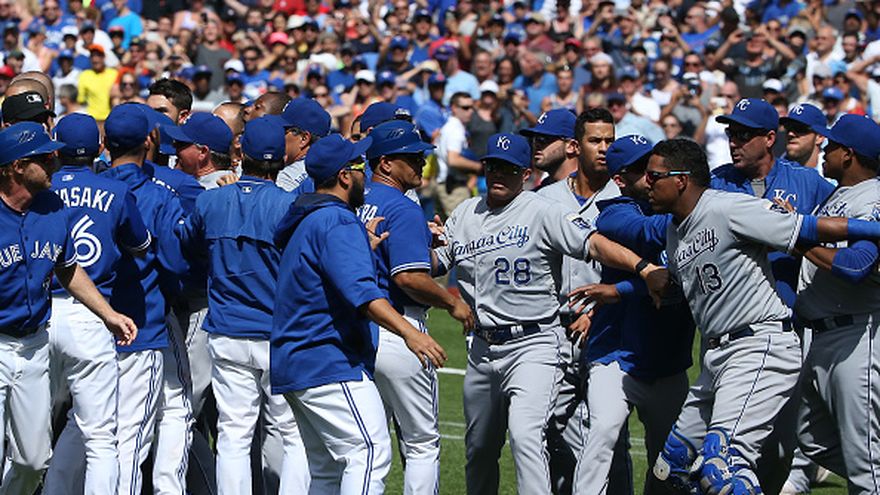 Ambas bancas y bullpens se vaciaron luego que el relevista de Toronto Aaron Sánchez fue expulsado por pegarle en un muslo a Alcides Escobar de los Reales en el octavo. Fue la coronación de un tira y afloja durante el juego, precipitado cuando el abridor de los Reales Edinson Vólquez estampó un pitcheo en el brazo izquierdo de Josh Donaldon en el primero.