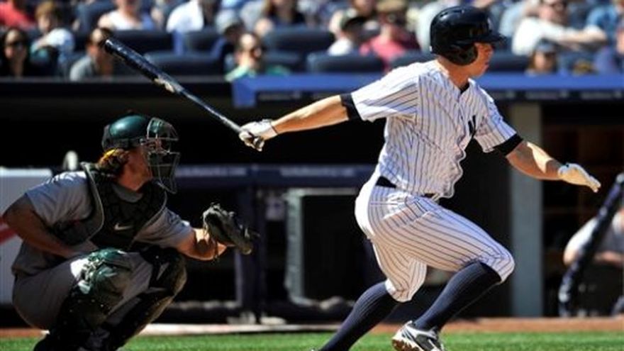 Phil Hughes colgó ocho ceros al lanzar pelota de cuatro hits para su primera victoria de la campaña y los Yanquis de Nueva York derrotaron el sábado 4-2 a los Atléticos de Oakland. Chris Stewart y Lyle Overbay conectaron jonrones ante el dominicano Bartolo Colón, con lo que los Atléticos perdieron por primera vez en las seis aperturas del derecho en lo que va del año. Hughes (1-2) ponchó a nueve al superar a su ex compañero en la rotación de los Yanquis, que han ganado siete de sus últimos nueve partidos de una tanda de 10 como locales. Oakland ha perdido 10 de 15 tras comenzar la campaña con foja de 12-4. Los Atléticos tienen foja de 13-3 contra equipos de su división, el Oeste de la Liga Americana, y 4-11 contra los demás. Robinson Canó conectó el doble número 344 de su carrera y empató a Mickey Mantle en el octavo lugar de la lista histórica de los Yanquis. Anotó después tras un sencillo de Travis Hafner. Colón (3-1) toleró seis hits en cinco innings y un tercio, su apertura más corta de a temporada. En ese partido, el lanzador panameño Mariano Rivera lanzó un episodio completo, toleró un imparable y una carrera, también dio una base por bola. Sin embargo llegó al juego cuando no había situación de salvamento. Por los Atléticos, el cubano Yoenis Céspedes de 4-2, una anotada. Por los Yanquis, los dominicanos Robinson Canó de 4-1, una anotada, y Eduardo Núñez de 3-1, con triple y una anotada.