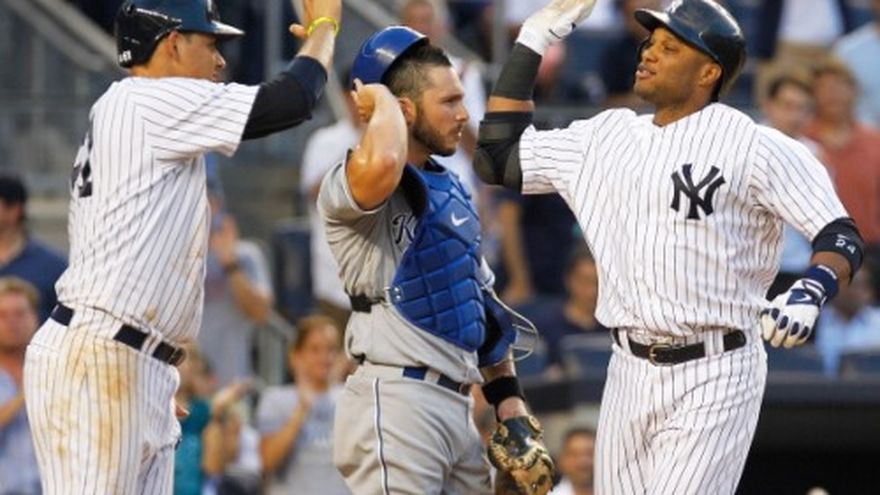 El dominicano Robinson Canó bateó un jonrón de tres carreras, Lyle Overbay agregó un grand slam y los Yanquis de Nueva York salieron el miércoles de su marasmo ofensivo con una paliza de 8-1 sobre los Reales de Kansas City. Iván Nova, también dominicano, tuvo otro desempeño impresionante en el montículo y los Yanquis, que sólo habían podido anotar una carrera en cada uno de los tres días previos, lograron romper una racha de tres derrotas. Sin embargo, otros dos de sus peloteros quedaron lesionados: Travis Hafner, que se encuentra en un bache ofensivo, y el veloz Brett Gardner. Hafner salió con un golpe en el pie izquierdo, mientras que Gardner tenía un moretón en la pierna derecha tras ser alcanzado por un lanzamiento. Las radiografías de ambos no mostraron problemas serios y estarán bajo observación diaria. Los Yanquis ya tienen lesionados a los estelares Derek Jeter, Curtis Granderson y Alex Rodríguez. Gardner se embasó cuatro veces, incluidas dos por base por bolas, y anotó dos carreras. Nova (4-2) sólo permitió cuatro sencillos y un doble en ocho innings, en el que fue su segundo triunfo en tres buenas salidas desde que regresó de las ligas menores. Recetó seis ponches y otorgó dos boletos. Canó y Overbay conectaron vuelacercas frente a Wade Davis (4-8), que perdió por tercera ocasión consecutiva. Con dos outs en la tercera entrada, Canó colocó la pelota por encima del muro entre el jardín izquierdo y el central, su 21er cuadrangular de la temporada. El toletero será el capitán de la Liga Americana en el derby de jonrones el próximo lunes en el Citi Field. Por los Reales, el venezolano Alcides Escobar de 3-0, con una anotada. Por los Yanquis, los dominicanos Canó de 4-3, con dos anotadas y tres producidas, Zoilo Almonte de 3-0, con una anotada, y Eduardo Núñez de 4-1. El mexicano Luis Cruz de 4-1, con una anotada.