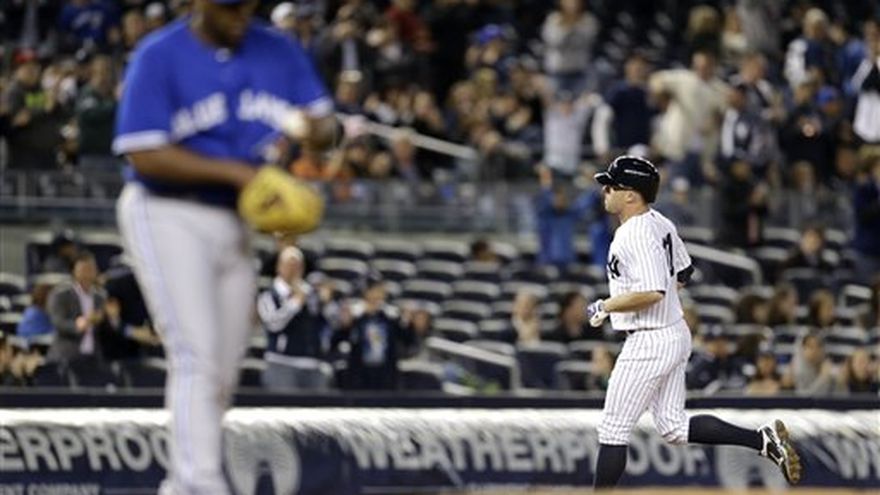 David Phelps ponchó a nueve —la mayor cantidad de su carrera— en cuatro innings tras entrar en relevo del lesionado Iván Nova, el receptor Chris Stewart sorprendió a dos corredores para enfriar posibles rachas ofensivas de Toronto al tomar el lugar del también lesionado Francisco Cervelli y los Yanquis de Nueva York vencieron 6-4 a unos empecinados Azulejos de Toronto el viernes. El venezolano Cervelli, receptor de los Yanquis, se rompió la mano derecha con el quinto lanzamiento del dominicano Nova y dos innings después el abridor de Nueva York dejó el montículo con un dolor en el codo derecho. El equipo anunció que Cervelli necesita cirugía y se perderá al menos seis semanas. Lyle Overbay remontó la carrera de la ventaja con un triplete y Vernon Wells agregó un elevado de sacrificio ante lanzamiento de Aaron Laffey en un inning en que el abridor —que tomó el lugar de Josh Johnson— dio cuatro pasaportes, ayudando a Nueva York a superar dos cuadrangulares del dominicano Edwin Encarnación. David Robertson recibió un profundo jonrón del dominicano José Bautista en la octava entrada pero Brett Gardner recuperó la ventaja de dos carreras de los Yanquis con un vuelacerca en la parte baja del mismo inning. El cerrador panameño Mariano Rivera llenó la casa con dos outs en el noveno episodio pero ponchó a Colby Rasmus para poner fin al encuentro con 36.151 aficionados de pie coreando "Vamos Mo!" en su octavo salvamento en igual número de oportunidades. Por los Yanquis, el dominicano Robinson Canó de 4-1 con carrera anotada y Eduardo Núñez de 3-0 con anotada y producida. Por los Azulejos, los dominicanos Encarnación de 4-2 con dos carreras anotadas y dos remolcadas, Bautista de 4-1 con anotada e impulsada, Melky Cabrera de 4-1. El venezolano Maicer Izturis de 4-1.