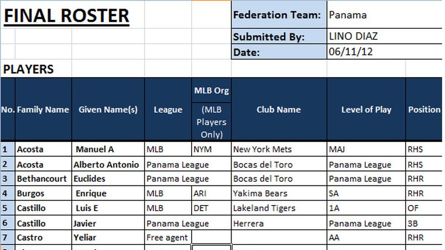 La lista de la selección que representará a Panamá en las eliminatorias al III Clásico Mundial de Béisbol ya está preparada para ser enviada a las oficinas de las Grandes Ligas. El equipo, dirigido por el expelotero Roberto Kelly, está integrado por un total de 16 jugadores que están vinculados a organizaciones de la Gran Carpa, 10 que participaron en los campeonatos nacionales de béisbol mayor y dos que se encuentran como agentes libres. Aunque se encuentra en la lista, aún no está garantizada la presencia del jardinero Luis Durango quien juega actualmente en la Liga Venezolana de Béisbol Profesional para los Caribes de Anzoátegui. En estos momentos se gestiona su permiso para que pueda jugar. El equipo se mantiene entrenando en el estadio Omar Torrijos de Santiago de Veraguas, mientras llega el inicio del evento que se llevará a cabo del 15 al 19 de noviembre en el coliseo Rod Carew de la ciudad de Panamá. La foto muestra la lista que ya está publicada en la página de internet de la Federación Panameña de Béisbol (Fedebeis).