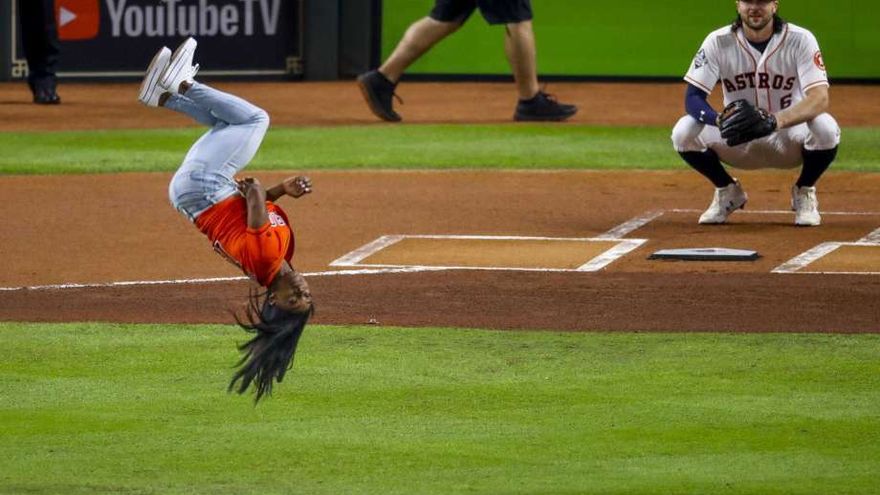 La medallista olímpica Simone Biles sorprendió este miércoles al realizar un acrobático giro de 360 grados en el aire antes de hacer el primer lanzamiento del segundo juego de la Serie Mundial de béisbol entre los Astros de Houston y los Nacionales de Washington.