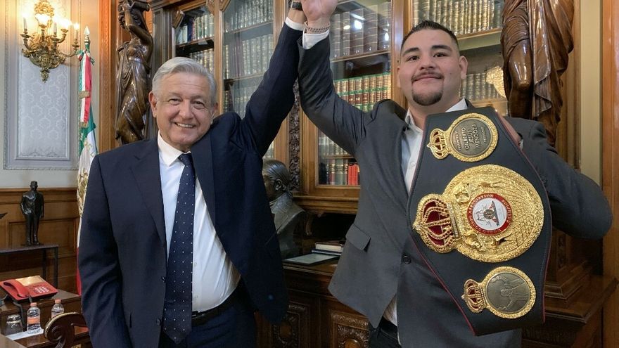 Ruiz Jr. se reunió con López Obrador en el Palacio Nacional en Ciudad de México, donde le mostró al mandatario izquierdista sus nuevos cinturones de campeón de la Asociación Mundial (AMB), la Federación Internacional (FIB) y la Organización Mundial de Boxeo (OMB).