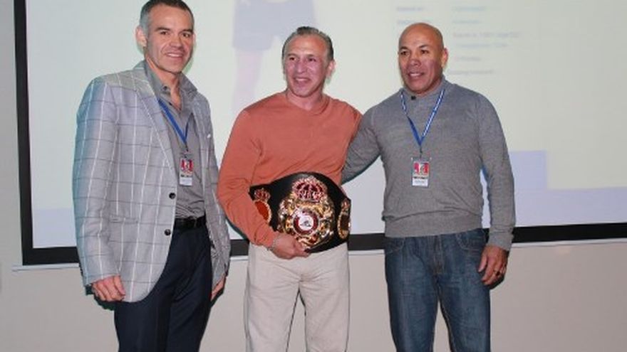 El campeón ligero Ray Boom Boom Mancini fue declarado súpercampeón de por vida y recibió la faja de oro con diamantes de la Asociación Mundial de Boxeo, de manos del vicepresidente Gilberto Jesús Mendoza, durante la 92 Convención Anual en Lima. Mancini emocionado agradeció el gesto, "esto me trae tantos recuerdos, se activa mi memoria, siento como aquel momento que gané mi título. Gracias a la AMB, gracias por este momento, y por traerme invitado a la Convención". El campeón dijo sentirse feliz por los recuerdos y con su faja en la cintura abrazó emocionado al peruano Orlando Romero, quien se acercó tras la entrega del reconocimiento. Mancini es uno de los invitados especiales de la 92 Convención Anual de la AMB, y compartió con los asistentes al conversar acerca de su vida. TEXTO: Hilmar Rojas Erazo (AMB)