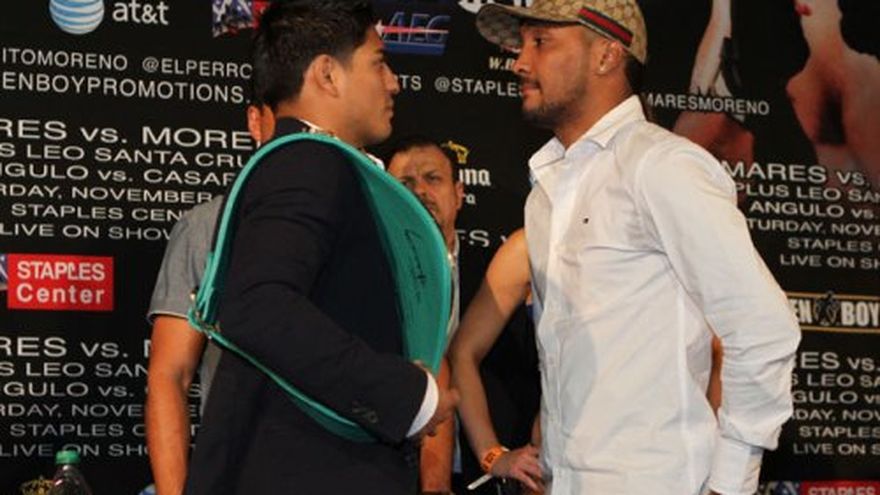 El panameño Anselmo "Chemito" Moreno y el mexicano Abner Mares se vieron las caras hoy por primera vez antes de la pelea que ambos tendrán el próximo 10 de noviembre en el Staples Center de Los Ángeles, California (Estados Unidos). El pleito, pactado a 12 asaltos y 122 libras, será por el título súpergallo del Consejo Mundial de Boxeo (CMB) en poder de Mares. "Después que derroté a Vic Darchinyan (el 3 de diciembre del año pasado), hice un reto a todos los grandes boxeadores de las 118 y 122 libras", declaró Moreno durante la conferencia de prensa en la que se realizó el lanzamiento oficial de la función boxística que se realizará el décimo día de noviembre. "Tuve esta oferta y la tomé. Subo a las 122 libras porque es allí donde está el dinero y las grandes figuras." Moreno (33-1-1, 12 nocauts), quien es el actual súpercampeón gallo de la Asociación Mundial de Boxeo (AMB), enfatizó en su deseo por enfrentar a Mares al que dijo respetar. "Esta es una gran oportunidad. Abner Mares es un gran campeón. Miro hacia el 10 de noviembre para pelear con un compañero que es campeón del mundo", agregó. Por su parte, Mares (24-0-1, 13 nocauts) no ocultó su emoción de pelear en Los Ángeles en una ciudad que es del mismo estado donde reside. "No quiero agradarle a la gente; quiero que me respeten", declaró el púgil azteca. "Quiero pelear con los mejores, los grandes ganadores del 10 de noviembre serán los fanáticos". Mares también elogió a su próximo rival. "Moreno no ha perdido en 10 años. Es un boxeador difícil, muy talentoso, técnico y defensivo que sabe como caminar el ring", añadió. "Esta será una pelea extremadamente difícil para mí, pero la quería. He estado entrenando muy duro para ella."
