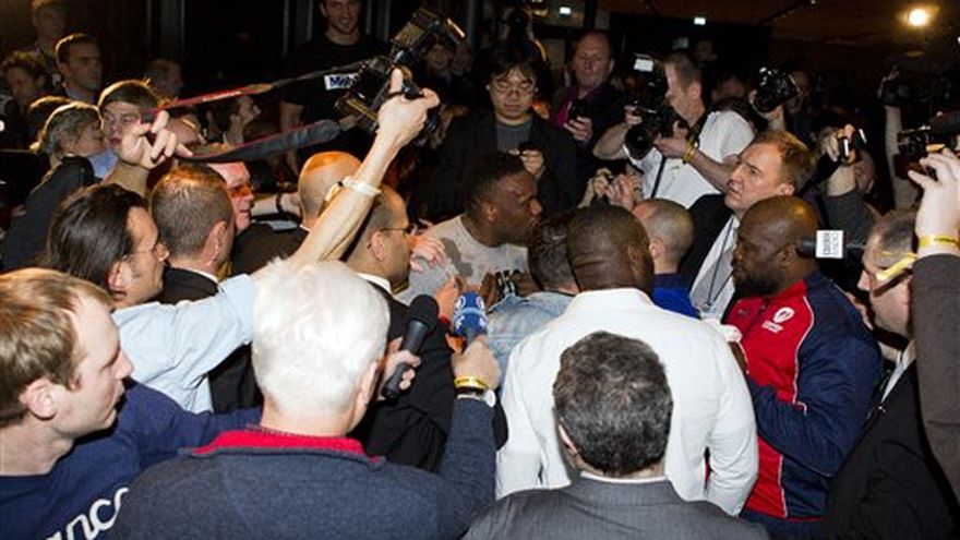El peso pesado británico Dereck Chisora salió en libertad el domingo, luego de haber sido detenido por la policía de Munich para ser interrogado por la policía después de perder una pelea de título mundial con Vitali Klitschko y protagonizar una trifulca con el ex campeón de la AMB David Haye. Tras ser detenidos durante siete horas, Chisora y su entrenador, Don Charles, salieron de la sede policial en una camioneta negra. El vocero policial Gottfried Schlicht informó a The Associated Press que Chisora encara posibles cargos por agresión física. Chisora y harles fueron detenidos el domingo en un aeropuerto de Munich y retenidos para ser interrogados. Schlicht agregó que la policía buscaba a Haye, que no estaba en su hotel. "No sabemos dónde está", dijo. El diario Sueddeutsche Zeitung de Munich informó que Haye se dirigió al aeropuerto tras la pelea y tomó un vuelo al amanecer. Durante la reyerta, a Chisora se le escuchó cuando amenazó con darle un tiro a Haye. "David, te juro por Dios, que te voy a pegar un tiro, te voy a pegar un tiro. Le voy a dar un tiro a David Haye", gritó Chisora mientras aseguraba que Haye le agredió con un vaso. Chisora y Haye, ambos londinenses, se trenzaron a golpes después que Chisora perdió por decisión unánime ante Vitali Klitschko en su combate por el título máximo del CMB. Chisora se mofó de Haye echándole en cara que hubiese perdido el cetro del CMB ante el hermano menor de Klitschko, Wladimir, en julio, y empezaron a discutir hasta que Chisora derribó una botella que Haye tenía en la mano y se liaron a puñetazos. Haye también se peleó con miembros de la comitiva de Chisora y el entrenador de este, Adam Booth, se quedó sangrando de un corte en la cabeza. Volaron algunas cámaras y los reporteros se replegaron hasta que el personal de seguridad logró separar a los combatientes y la policía llegó al lugar. "Decididamente perdiste esta vez", le dijo Chisora a Haye. Klitschko, de 40 años, le ganó a Chisora en una pelea reñida y después dijo que desde el cuarto asalto había tenido que pelear únicamente con la mano derecha después de lesionarse el hombro izquierdo. El ucraniano fue examinado en un hospital de Munich el domingo para determinar la magnitud de la lesión. "Creo que todos oímos excusas sobre un dedo del pie fracturado", dijo Chisora tras la pelea, refiriéndose a lo que alegó Haye después de perder con Wladimir Klitschko en Alemania en julio. Chisora recibió poco apoyo del público después de abofetear en la cara a Vitali Klitschko en el pesaje el viernes. También escupió agua en la cara de Wladimir antes de la pelea.
