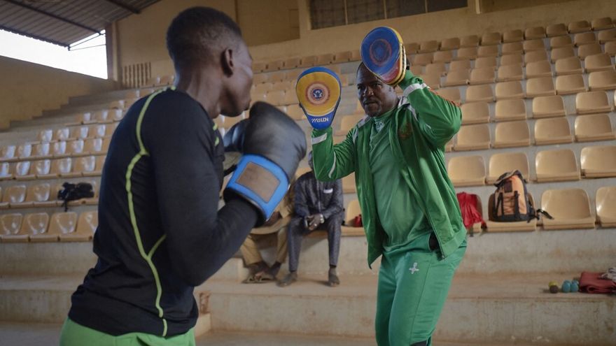 A pies del ring, chándal con los colores de Níger, Abdoul Aziz Ousseini, alias 'Aziz', antiguo campeón de boxeo de los pesos pesados, da consignas a sus jóvenes pupilos arrancados de la calle, en el club de boxeo de la capital Niamey.