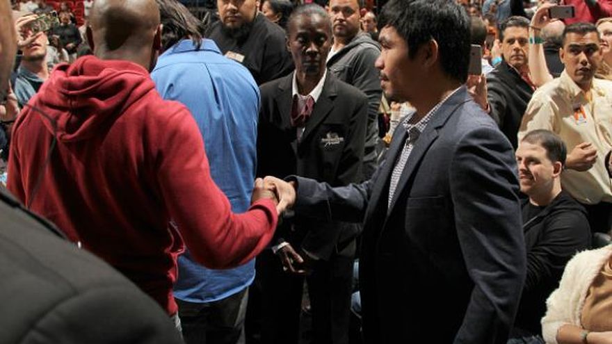 Mientras que Mayweather vacacionaba, Pacquiao regresaba el jueves a su natal Filipinas luego de una gira a Estados Unidos e Inglaterra. Mientras estuvo en Miami para participar como juez del concurso de Miss Universo, Pacquiao asistió a un partido de la NBA la misma noche en que lo hizo Mayweather y ambos púgiles intercambiaron teléfonos y hablaron sobre la pelea.