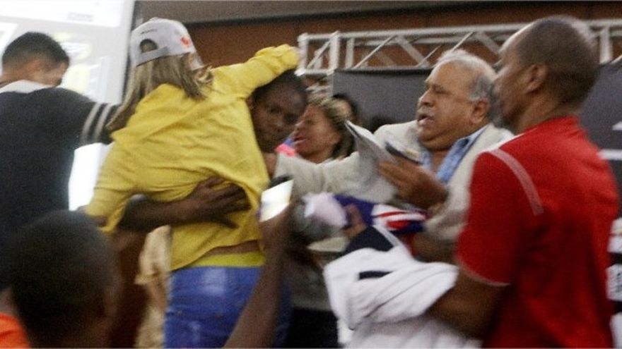 Cuando todo indicaba que el acto terminaría de manera normal, Mosquera se le encimó a la venezolana y ésta respondió con un empujón. La panameña utilizó un recto de derecha al estómago de la campeona.