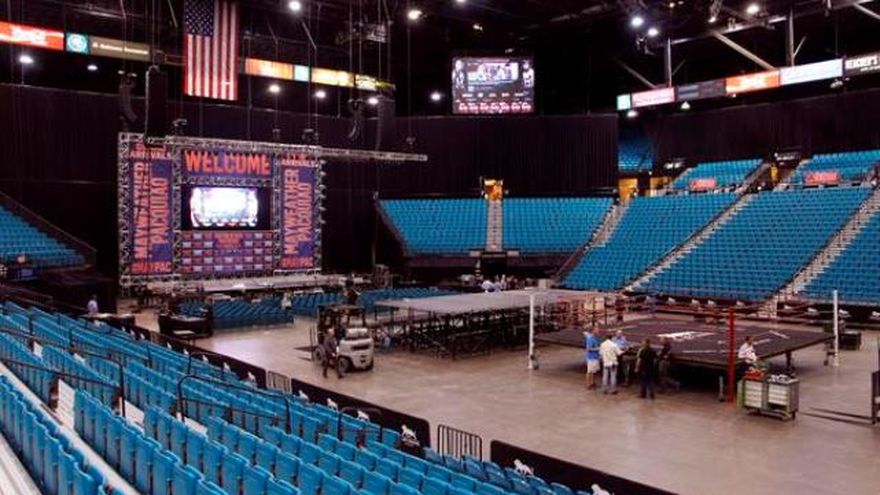 En una de las esquinas de la Arena Garden, están montado una estructura que más que parece más lista para un concierto que para conocer el tonelaje que marcarán Floyd y Manny, ahí, un grupo de técnicos se dedica a probar las luces.